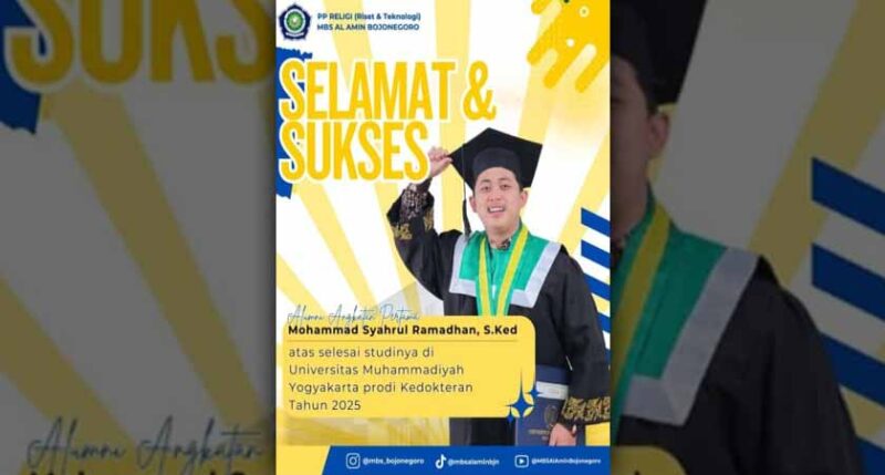 BOJONEGORO, mbsalamin.com – Kabar membanggakan datang dari salah satu alumni terbaik SMA MBS Al Amin Bojonegoro, Muhammad Syahrul Ramadhan, S.Ked, yang telah berhasil menyelesaikan studi kedokteran di Universitas Muhammadiyah Yogyakarta (UMY) tahun 2025. Syahrul, yang merupakan bagian dari generasi pertama SMA MBS Al Amin, kini resmi menyandang gelar Sarjana Kedokteran (S.Ked) setelah melalui perjalanan akademik yang penuh dedikasi dan kerja keras.