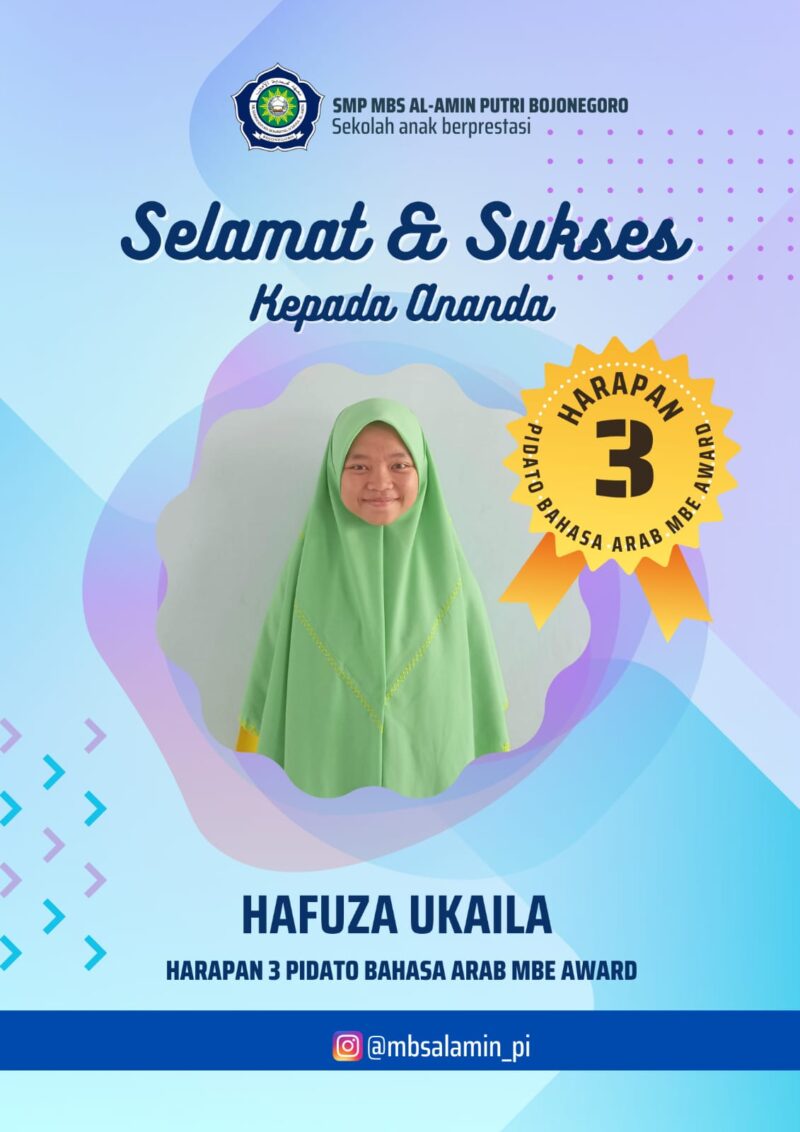Selamat Kepada Hafuza Ukaila yang mendapatkan Harapan 3 Pidato Bahasa Arab di MBE Award – SMP MBS Al Amin Bojonegoro Putri